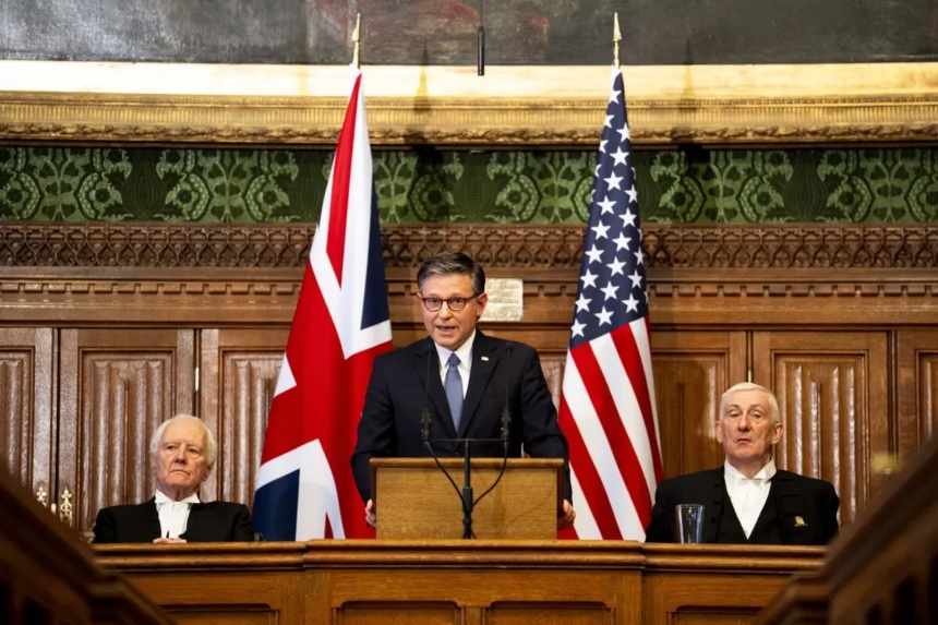 El presidente de la Cámara de Representantes de Estados Unidos, Mike Johnson (R-La.) (centro), se dirige a los diputados de la Cámara de los Comunes junto al presidente de la Cámara de los Lores del Reino Unido, Lord McFall (izquierda), y el presidente de la Cámara de los Comunes del Reino Unido, Sir Lindsay Hoyle (derecha), en Londres, el 20 de enero de 2026. (Jordan Pettitt-WPA Pool/Getty Images)Durante los últimos cinco años, Lai, que padece diabetes, ha permanecido en régimen de aislamiento y fue privado de luz solar y aire fresco, según su hijo, Sebastien Lai.