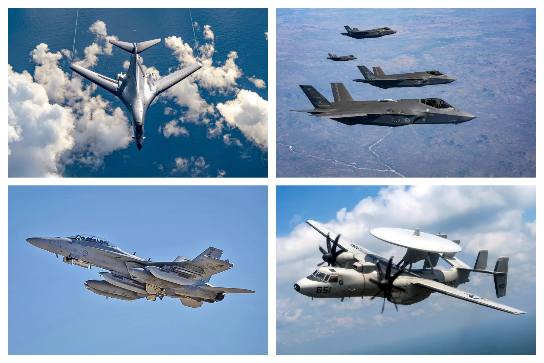 (Arriba a la izquierda) Un B-1B Lancer sobrevuela el océano Pacífico durante una misión de la Fuerza Operativa de Bombarderos el 20 de junio de 2022. (Arriba a la derecha) Los F-35A Lightning II de la Real Fuerza Aérea Australiana (RAAF) reciben combustible de un avión cisterna multifuncional KC-30A de la RAAF sobre Australia durante el ejercicio Talisman Sabre 23, el 23 de julio de 2023. (Abajo a la izquierda) Un EA-18G Growler de la RAAF despega de Amberley, Australia, para una misión durante el ejercicio Red Flag 23-1 en la base aérea de Nellis, Nevada, el 24 de enero de 2023. (Abajo a la derecha) Un E-2C Hawkeye asignado a los Greyhawks del Escuadrón Aéreo de Alerta Temprana (VAW) 120 sobrevuela Jacksonville, Florida, en esta imagen de archivo. (Sargento mayor Nicholas Priest/Fuerza Aérea de los Estados Unidos; Sargento técnico Eric Summers Jr./CC-PD-Mark; William R. Lewis/Fuerza Aérea de los Estados Unidos/Dominio público; Teniente j.g. John A. Ivancic/Armada de Estados Unidos)Los sistemas de China