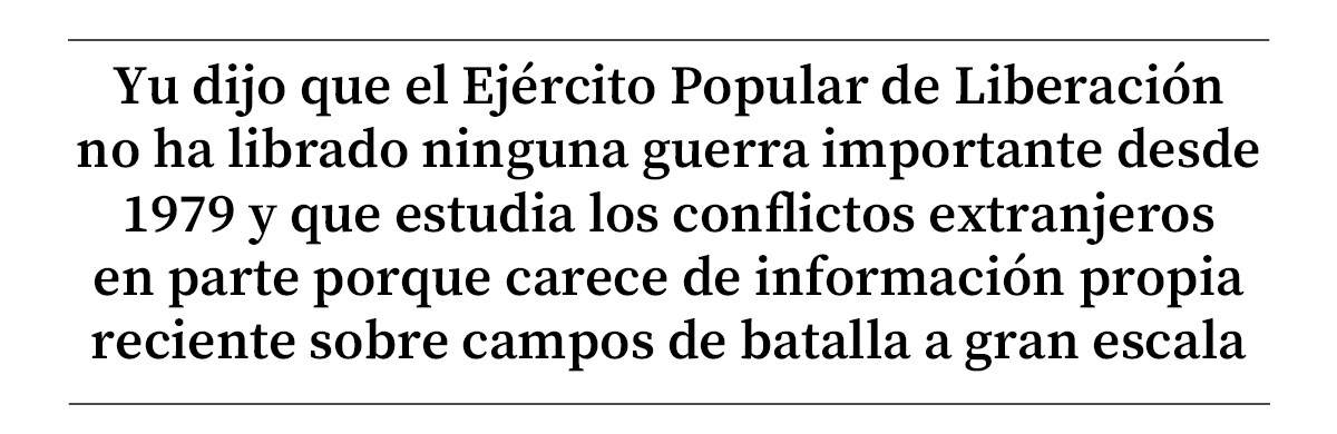 Yu dijo que la incursión estadounidense en Caracas puso de manifiesto los límites de la cultura militar china, que da prioridad a la propaganda y recompensa más las demostraciones pulidas que la validación dura y repetida en combate.Dijo que el Ejército Popular de Liberación (EPL) no ha librado una guerra importante desde 1979 y que estudia los conflictos extranjeros en parte porque carece de información propia reciente sobre el campo de batalla a gran escala.