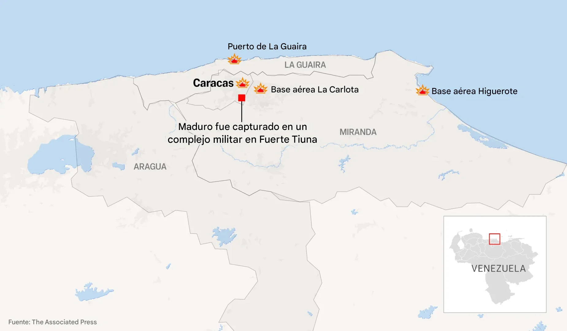 Esta ilustración muestra Caracas y los estados en los que, según el régimen venezolano, se produjeron ataques militares estadounidenses antes de la captura del líder venezolano Nicolás Maduro y su esposa el 3 de enero de 2025. (Anika Arora Seth, Phil Holm vía AP)