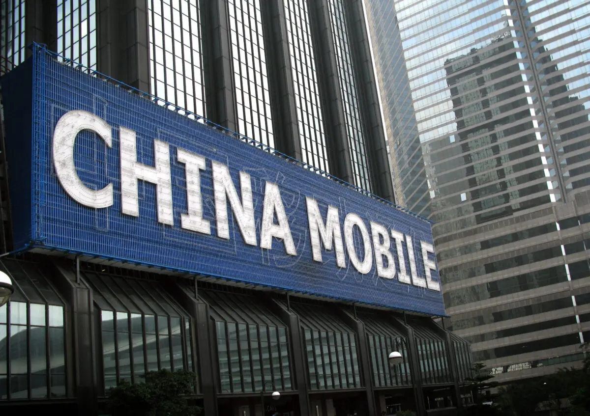 Un gran cartel publicitario de China Mobile en un edificio en Hong Kong el 14 de marzo de 2010. (Daniel Sorabji/AFP vía Getty Images)La FCC informa que alrededor del 75 % de todos los aparatos electrónicos se prueban en laboratorios de China.