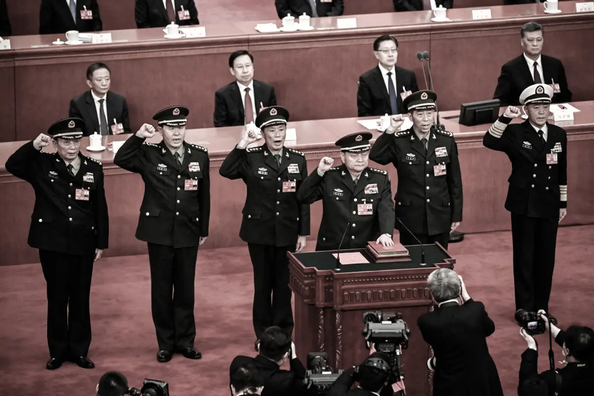 Zhang Youxia (delante) presta juramento junto a los miembros de la Comisión Militar Central tras su elección durante la cuarta sesión plenaria de la legislatura china, el Congreso Nacional del Pueblo, en el Gran Salón del Pueblo de Beijing, el 11 de marzo de 2023. (Greg Baker/Pool/AFP vía Getty Images)Shen señaló que en el editorial del PLA Daily del 25 de enero, en el que se anunciaba la destitución de Zhang Youxia, se enumeraban cinco cargos, todos ellos políticos, contra él. Sin embargo, dijo, en los editoriales y comentarios posteriores del PLA Daily, los cargos se cambiaron por corrupción.