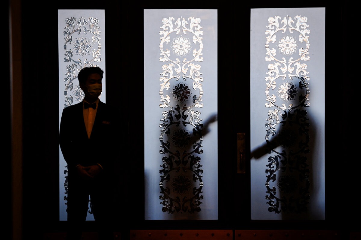 Guardias de seguridad detrás de una puerta de cristal en el Gran Salón del Pueblo durante la 14.ª Asamblea Popular Nacional celebrada en Beijing el 6 de marzo de 2024. (Greg Baker/AFP vía Getty Images).Dijeron que Zhang se opuso repetidamente al lanzamiento de una campaña militar inmediata, argumentando que esto correría el riesgo de una intervención de Estados Unidos y sus aliados.
