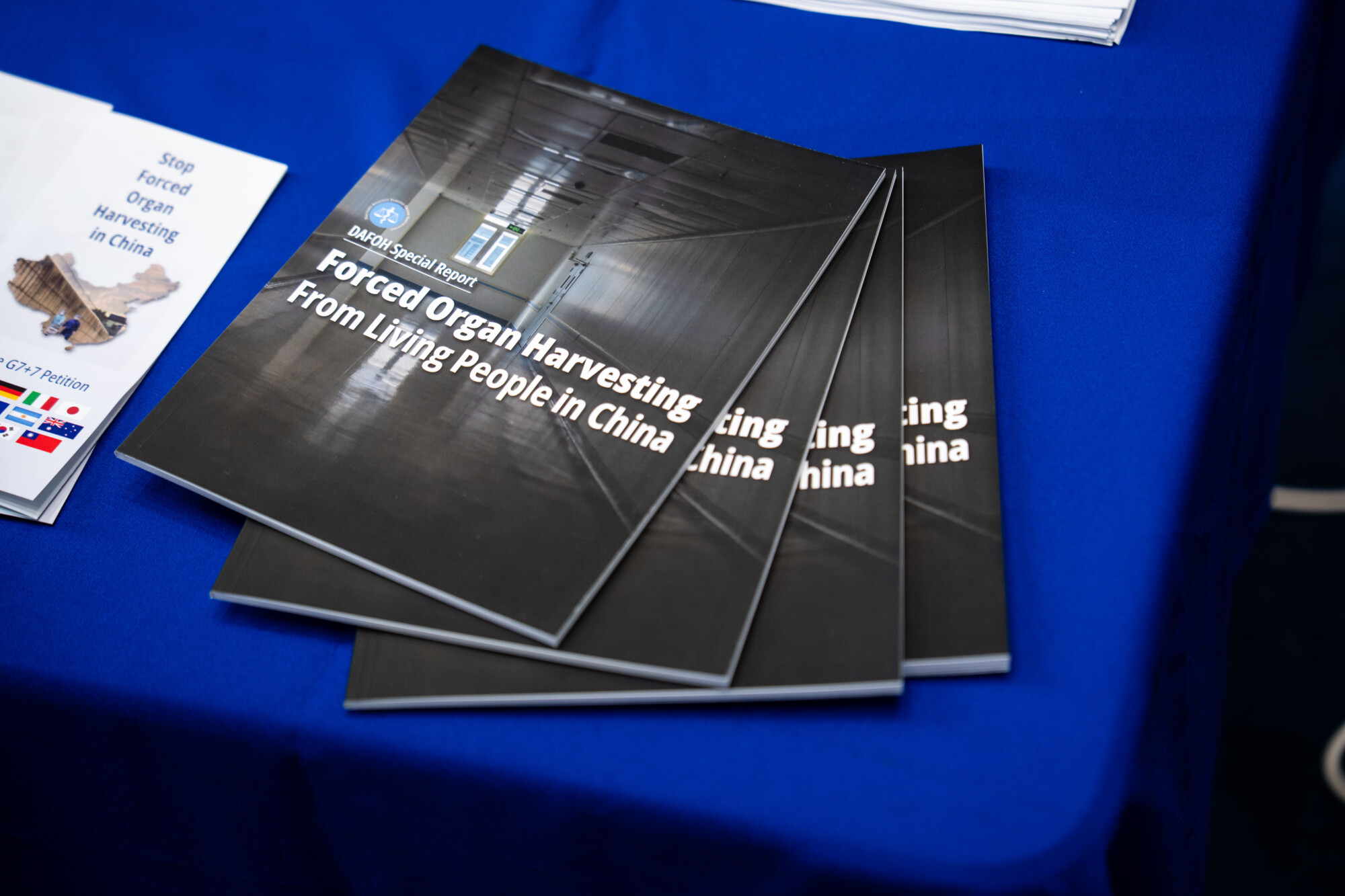 Un stand de Médicos contra la Sustracción Forzada de Órganos en la Feria de Derechos Humanos de China, realizada en el edificio Rayburn House Office Building, en Capitol Hill, Washington, el 10 de diciembre de 2025. (Madalina Kilroy/The Epoch Times)