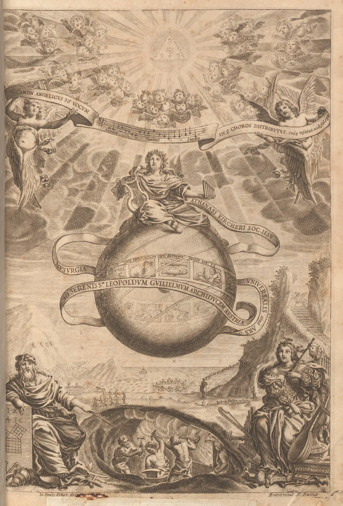 Pitágoras se sienta, con un brazo apoyado en este teorema y el otro apuntando hacia un grupo de herreros. Se dice que el sonido de sus martillos pitagóricos al golpear el metal le dio la noción de la base matemática de la armonía. Frontispicio de "Musurgia Universalis, Volumen I", 1650, de Kircher, Athanasius. Biblioteca de la Universidad de Cornell, Nueva York. (Dominio público).Instrumento antiguo para medir el sonido