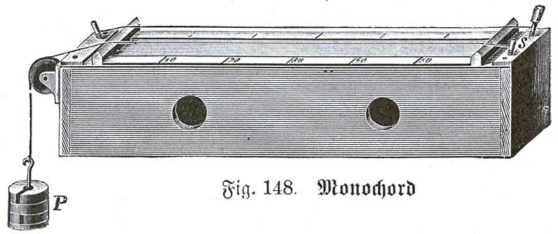 Un monocordio ilustrado en la Biblioteca de conocimientos generales y prácticos para candidatos militares, volumen III, 1905. (Dominio público).Pitágoras descubrió que proporciones específicas y simples crean sonidos consonantes, es decir, armoniosas.