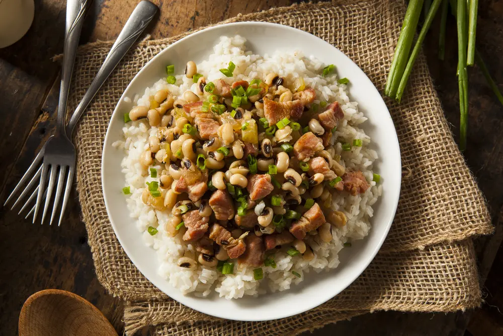 Los frijoles de ojo negro son un ingrediente esencial del Hoppin' John, un plato cocinado a fuego lento con arroz y a menudo condimentado con cerdo ahumado y especias, que se sirve con coles y pan de maíz.