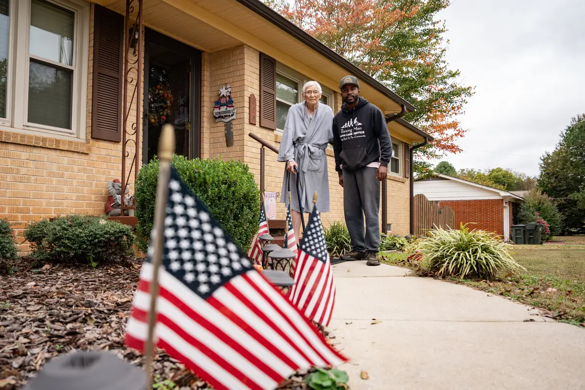 Rodney Smith Jr. (derecha) junto al veterano James Smith, de 90 años, después de cortar el césped de su jardín en Madison, Alabama, el 28 de octubre de 2025. (Samira Bouaou/The Epoch Times).