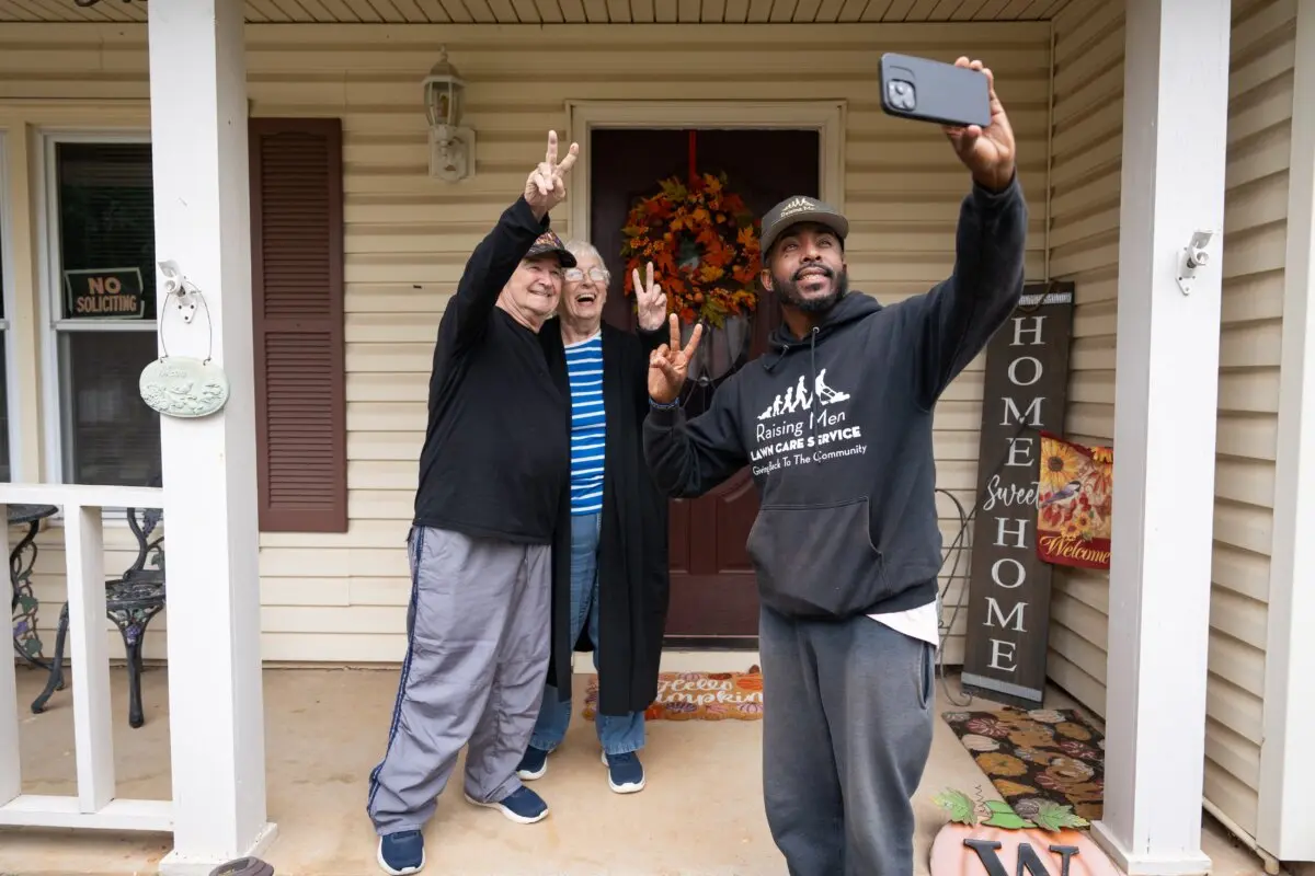 Después de terminar de cortar el césped, Rodney Smith se hace unas fotos con James Smith para publicarlas en las redes sociales y luego recoge todo para visitar la siguiente casa de su ruta. Su día está lleno de actos de bondad similares mientras va de una casa a otra, compartiendo momentos e historias por el camino.