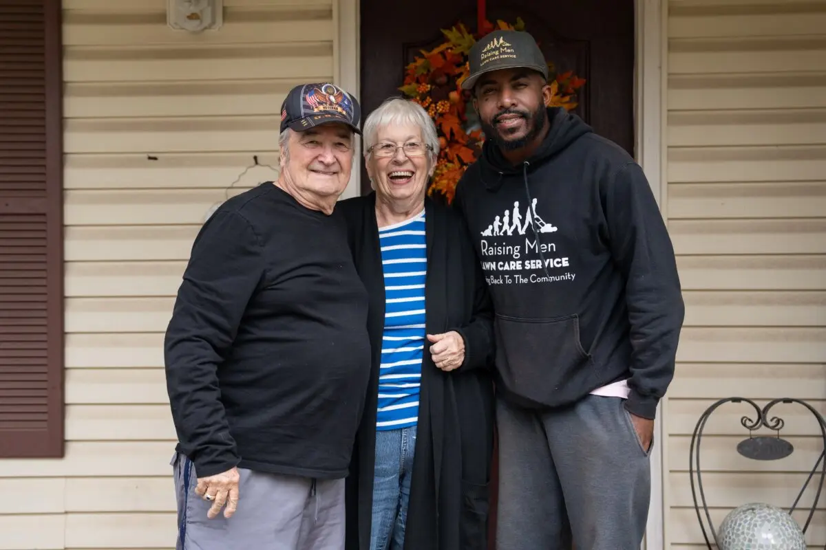 Rodney Smith Jr. (derecha), fundador de Raising Men Lawn Care Service, con Tom y Marguerite Weigand en Madison, Alabama, el 28 de octubre de 2025. (Samira Bouaou/The Epoch Times).Cortar el césped de los Weigand es una labor que Smith realiza con mucho cariño. Lleva años cortando su césped e incluso les llevó comida durante la pandemia.
