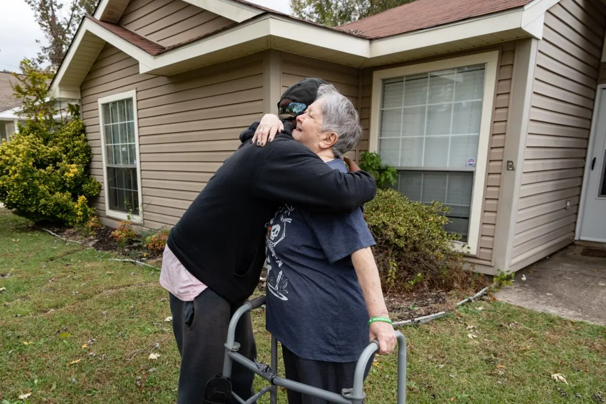 Rodney Smith Jr., fundador de Raising Men Lawn Care Service, abraza a Frances Helton en Madison, Alabama, el 28 de octubre de 2025. (Samira Bouaou/The Epoch Times).