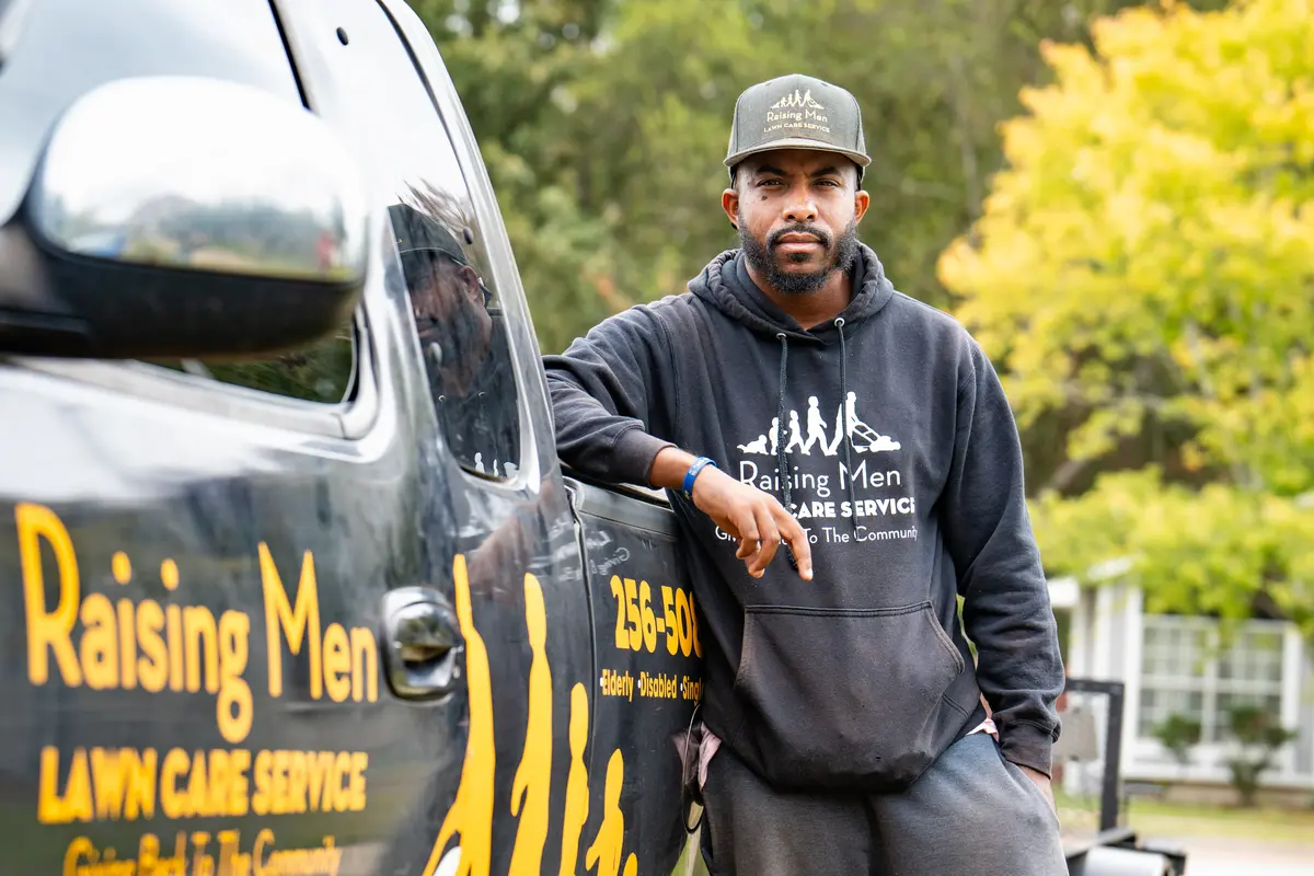 Rodney Smith Jr., fundador de Raising Men Lawn Care Service, delante de su camioneta en Madison, Alabama, el 28 de octubre de 2025. (Samira Bouaou/The Epoch Times).Smith dijo que obtuvo una maestría en trabajo social y sigue ayudando a los demás. Desde aquellos humildes comienzos, Smith calcula que ha cortado más de 6000 yardas.