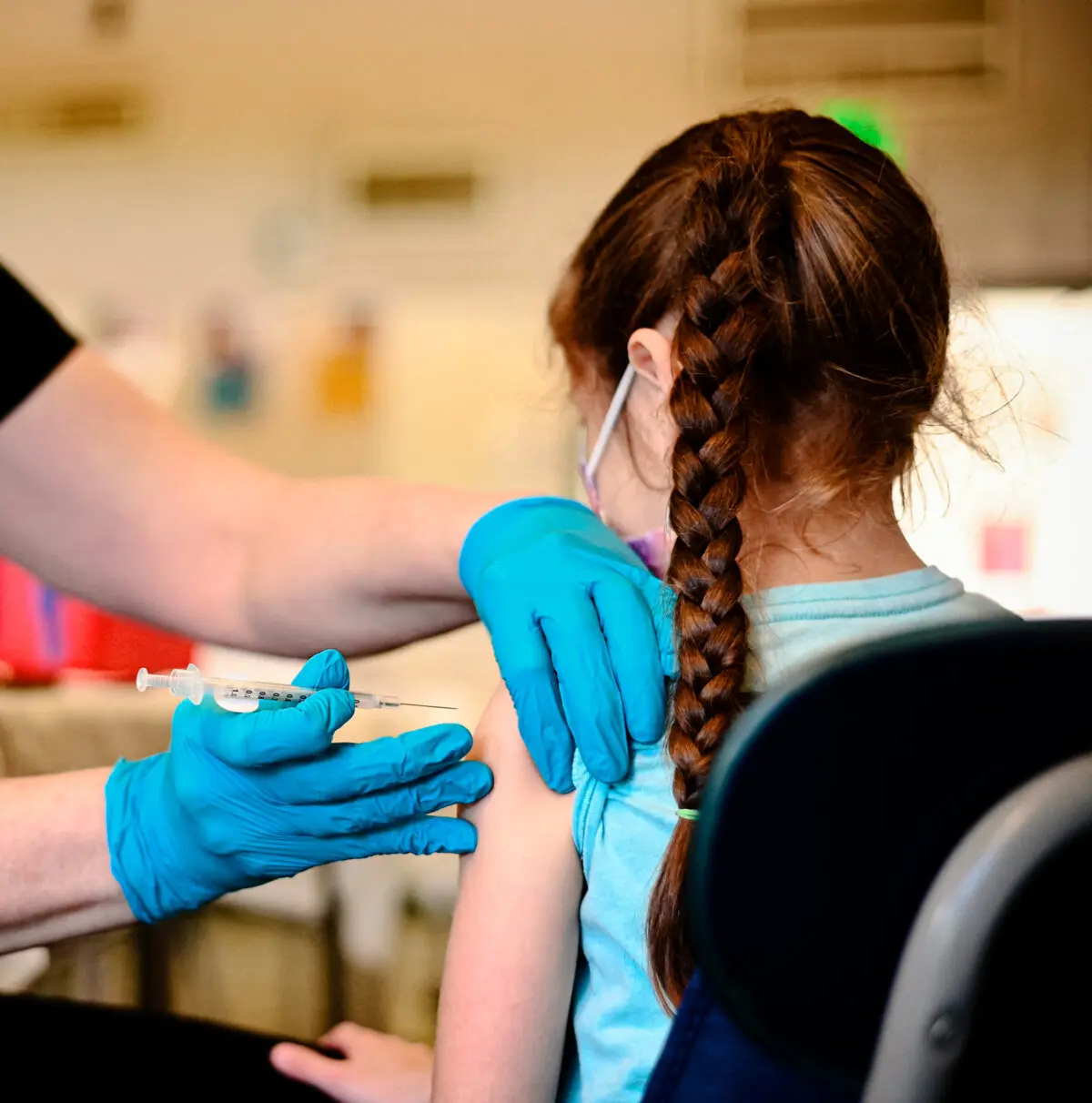 Una enfermera administra una dosis pediátrica de la vacuna contra COVID-19 a una niña en un centro de vacunación de L.A. Care Health Plan, ubicado en el Los Angeles Mission College, en el barrio de Sylmar, en Los Ángeles, el 19 de enero de 2022. (Robyn Beck / AFP vía Getty Images).Riesgo atribuido a las vacunas contra la gripe