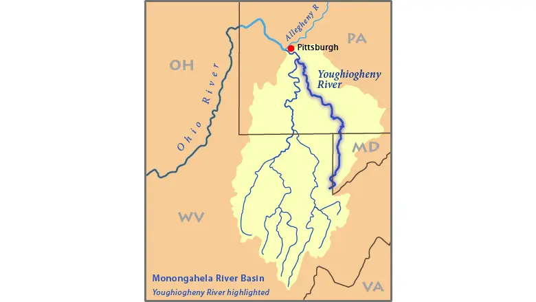 El río Youghiogheny, en Pittsburgh, donde se construyeron las embarcaciones para la expedición hacia el oeste de la Compañía de Ohio. DanMS/CC BY-SA 2.5El trabajo fue arduo y tomó mucho tiempo. El duro invierno lo hizo aún más difícil. Esperaban estar listos cuando, primero, el clima lo permitiera y cuando llegaran los otros 26 miembros de la Compañía de Ohio.