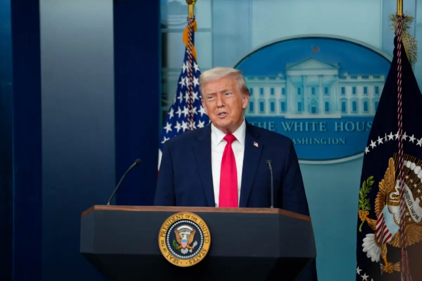 El presidente Donald Trump habla durante una rueda de prensa con motivo del primer año de su segundo mandato, en la Casa Blanca, el 20 de enero de 2025. (Madalina Kilroy/The Epoch Times)El presidente también reconoció que no está claro cómo se reembolsaría a los importadores.