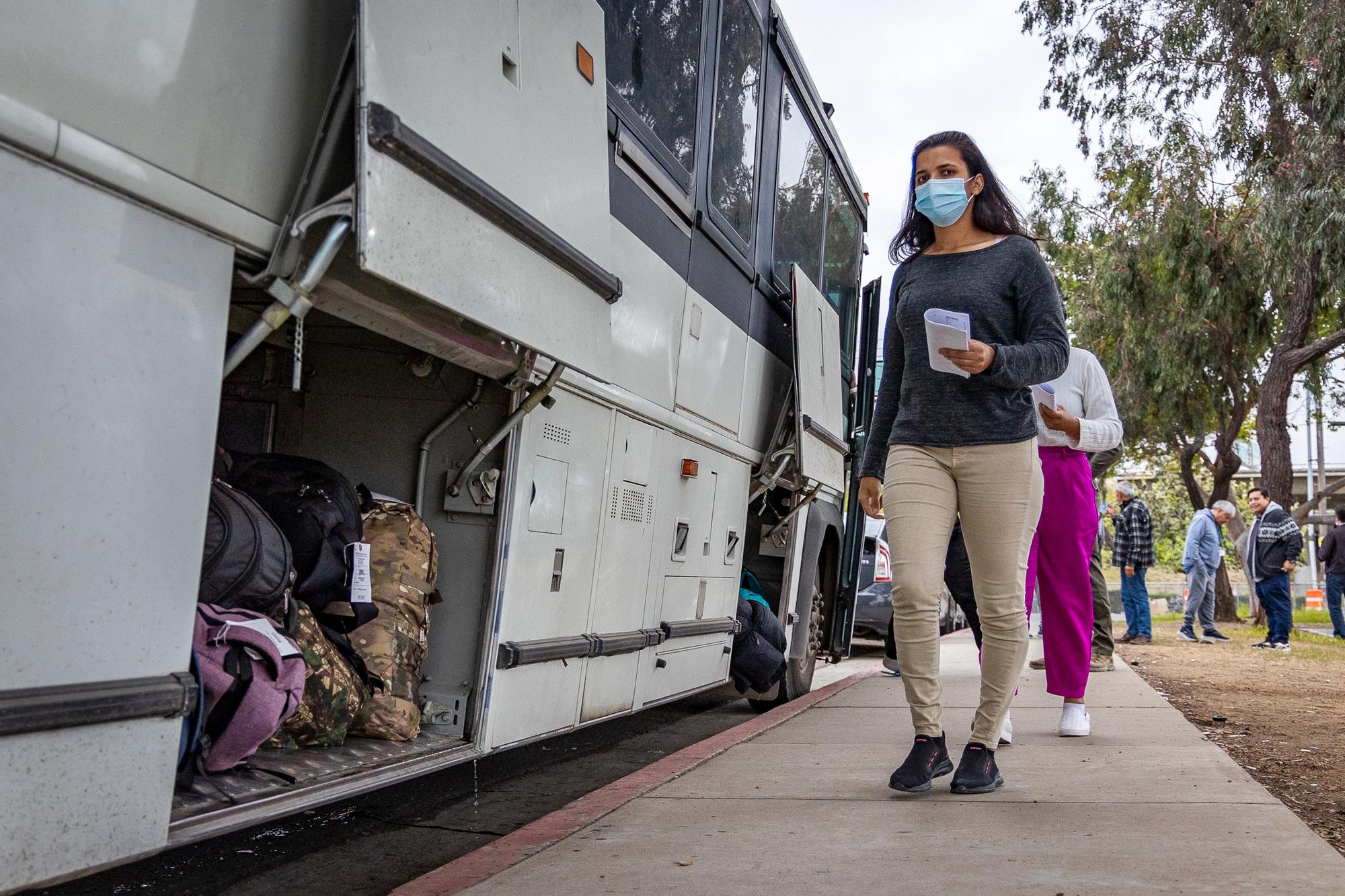 El 29 de febrero de 2024, varios autobuses dejan a un gran grupo de inmigrantes ilegales en San Ysidro, California. La Corte Suprema se dispone a examinar un caso que impugna la iniciativa del presidente Donald Trump de limitar la ciudadanía por nacimiento de los hijos de inmigrantes ilegales nacidos en Estados Unidos. (John Fredricks/The Epoch Times).¿Qué resolvió la Corte Suprema sobre la política de Trump?
