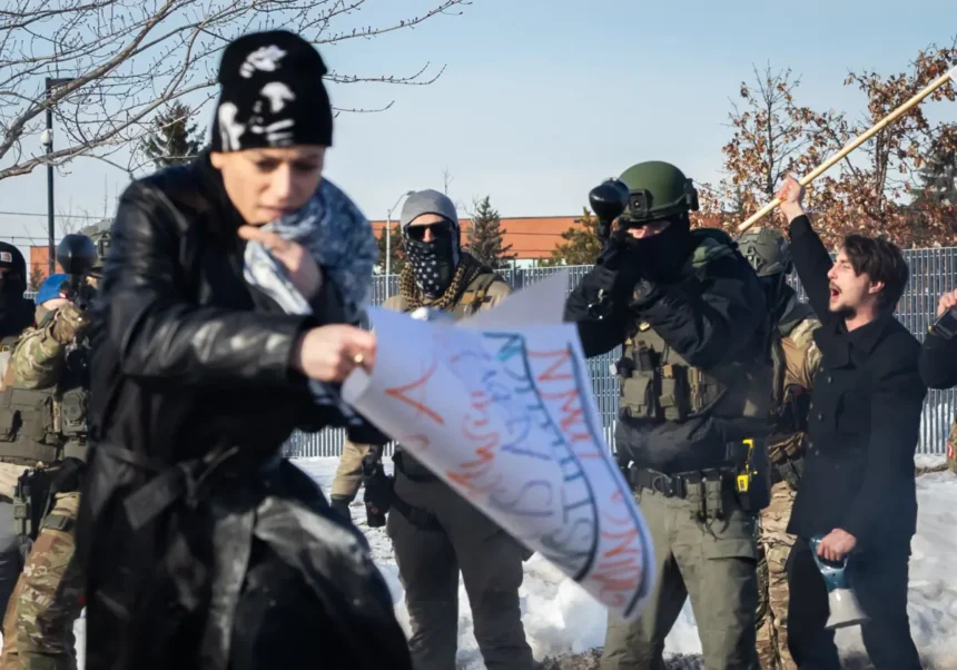 Manifestantes se enfrentan a oficiales federales frente al Edificio Federal Bishop Henry Whipple en Minneapolis, Minnesota, el 9 de enero de 2026. (John Fredricks/The Epoch Times)La disputa verbal provocó que los agentes en el lugar dispararan una serie de balas no letales hacia la multitud.