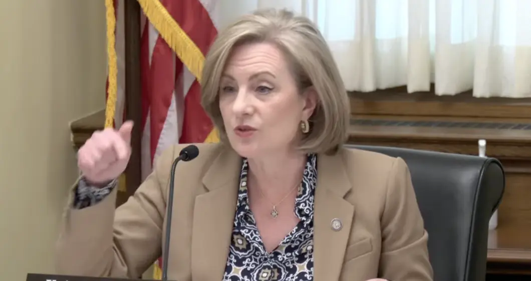 La representante de Minnesota Kristin Robbins, presidenta del Comité estatal de Políticas de Prevención del Fraude y Supervisión de la Agencia Estatal, en St. Paul, Minn., el 7 de abril de 2026. Captura de pantalla a través de la transmisión en vivo de The Epoch Times/La Cámara de Representantes de MinnesotaSe otorgaron contratos sin licitación y no se siguieron los procedimientos