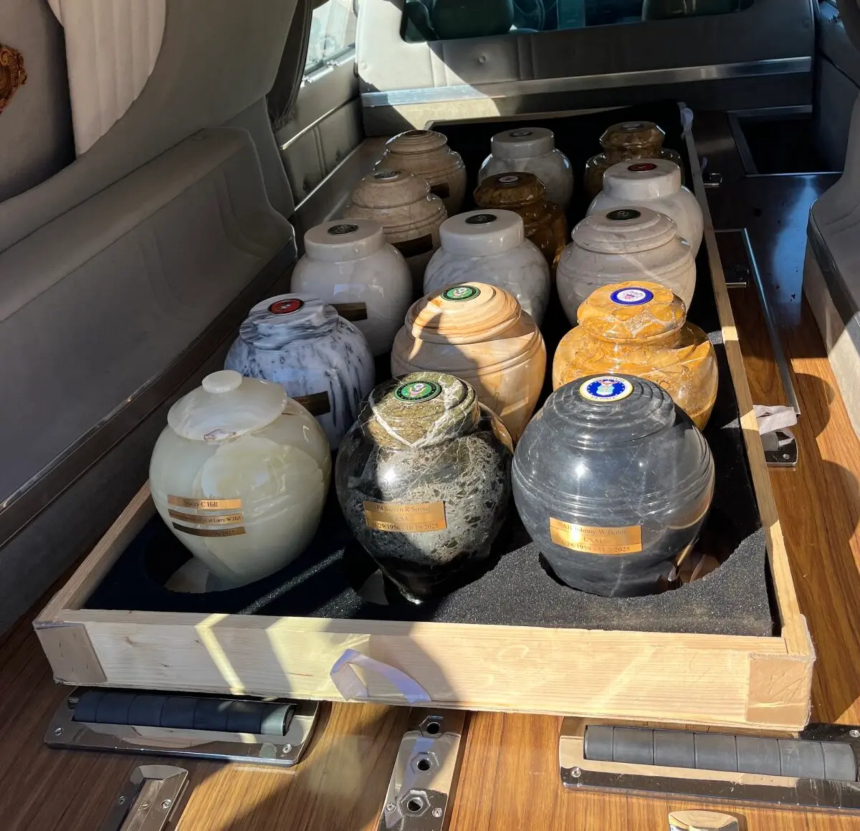 Los restos cremados de los veteranos descansan en urnas donadas en la parte trasera de un coche fúnebre antes de su entierro en el Cementerio Nacional Conmemorativo de Arizona, el 18 de marzo de 2026. (Allan Stein/The Epoch Times)A lo largo de casi dos décadas, los voluntarios visitaron 2957 funerarias, localizaron las cenizas no reclamadas de 39,713 veteranos, identificaron a 8177 y enterraron a 8038.