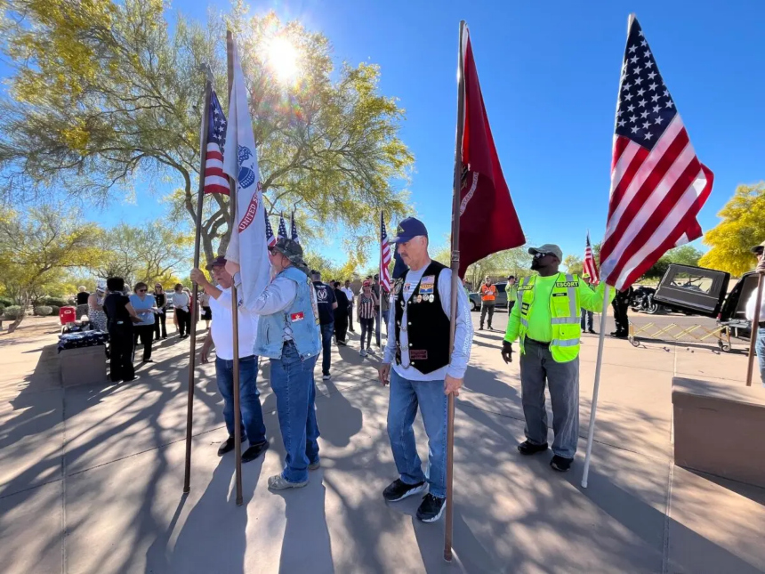 Bajo el ardiente cielo de Arizona, el coche fúnebre avanzó transportando los restos, flanqueado por motociclistas con chalecos de cuero y medallas, cuyas pancartas mostraban nombres como Arizona Patriot Guard Riders y American Legion Riders.