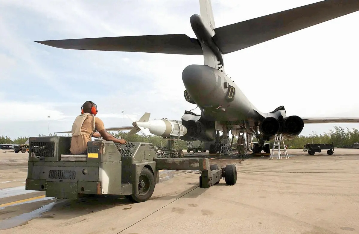 Un cargador de armas de la Fuerza Aérea de Estados Unidos entrega una bomba de 2000 libras para cargarla en un bombardero B1 en la base de Diego García, en las islas Chagos, el 22 de octubre de 2001. (USAF/DOD/AFP vía Getty Images)No habrá una "guerra interminable"