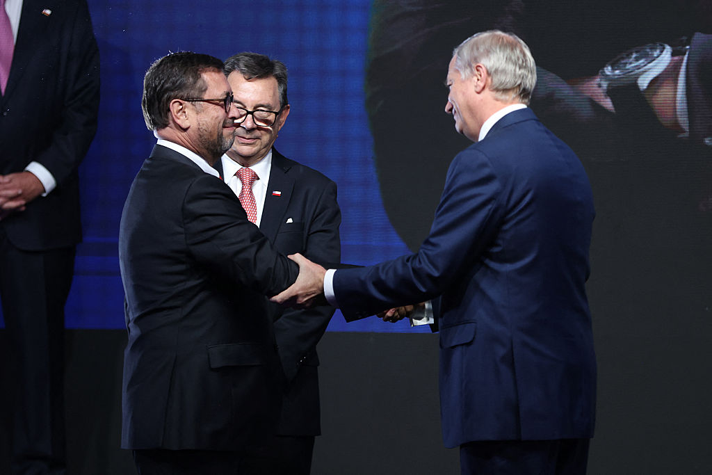 El presidente electo de Chile, José Antonio Kast (derecha), saluda a Francisco Pérez Mackenna como nuevo ministro de Relaciones Exteriores durante la presentación de su gabinete en la oficina del presidente electo, en Las Condes, Santiago, el 20 de enero de 2026. (Álvaro NARANJO / AFP a través de Getty Images)En la reunión bilateral también participaron los subsecretarios de Relaciones Exteriores, Patricio Torres, y de Relaciones Económicas Internacionales, Paula Estévez.