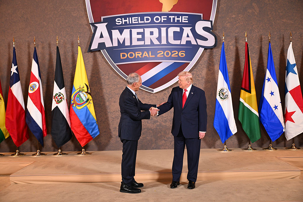 El presidente de Estados Unidos, Donald Trump, saluda a Nasry “Tito” Asfura, presidente de Honduras, durante la Cumbre “El Escudo de las Américas”, un encuentro con jefes de Estado y funcionarios gubernamentales de 12 países de América, celebrado en el Trump National Doral Golf Club en Doral, Florida. La Casa Blanca describe la cumbre como un evento histórico cuyo objetivo es reconfigurar las alianzas regionales y reforzar la influencia de Estados Unidos en el hemisferio occidental. (Foto de Roberto Schmidt/Getty Images)La reunión ocurre en el marco de la iniciativa regional denominada Escudo de las Américas, anunciada por el presidente Donald Trump el pasado 5 de marzo, y para la cual designó a Kristi Noem como enviada especial.