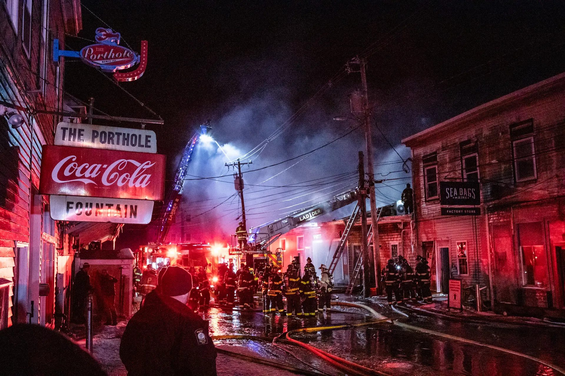 Bomberos combaten un incendio de tres alarmas en el histórico frente marítimo de Old Port en Portland, Maine, el 27 de diciembre de 2025. Las llamas y el humo se propagaron por estructuras a lo largo de Custom House Wharf, un centro de los siglos 19 y 20 para la industria pesquera de Portland que ahora incluye restaurantes de mariscos. Libby Kamrowski Kenny/Portland Press Herald vía AP