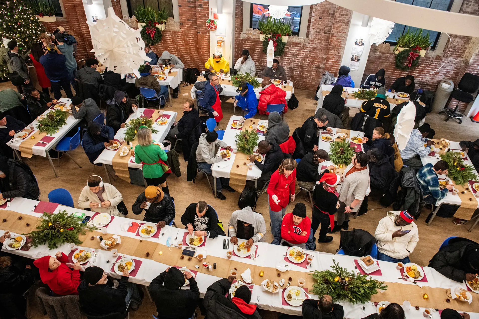 Personas comen sus alimentos en St. Francis House, el refugio diurno más grande de Nueva Inglaterra, el día de Navidad en Boston, el 25 de diciembre de 2025. Según un censo de 2025 realizado por la ciudad, hay 2,122 adultos solteros que experimentan situación de calle. Joseph Prezioso/AFP vía Getty Images