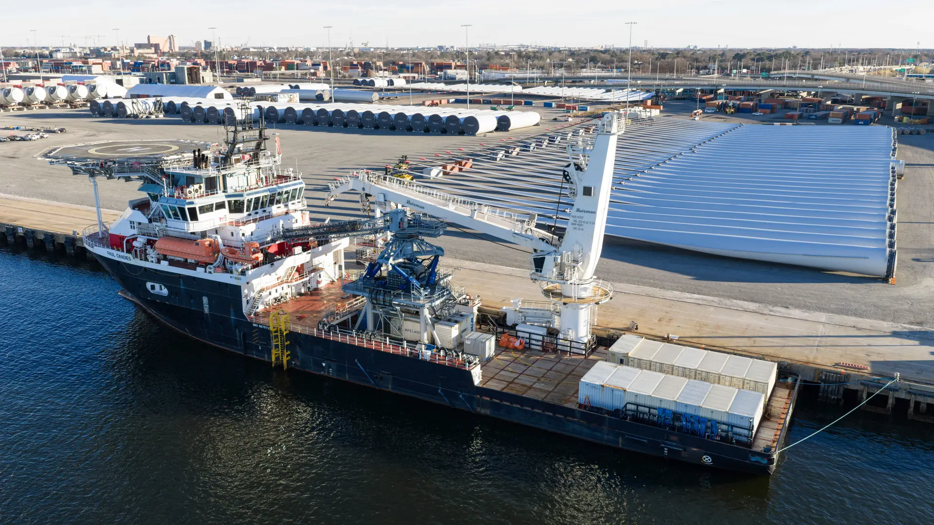 Bases, generadores y aspas de turbinas eólicas se ubican en la terminal marítima de Portsmouth junto con un buque de apoyo en el área de preparación para el proyecto de turbinas eólicas de Dominion Energy en Portsmouth, Virginia, el 22 de diciembre de 2025. La administración Trump ordena a 5 proyectos eólicos de gran escala en construcción frente a la Costa Este suspender sus actividades por al menos 90 días, según cartas del Departamento del Interior. Steve Helber/AP Photo