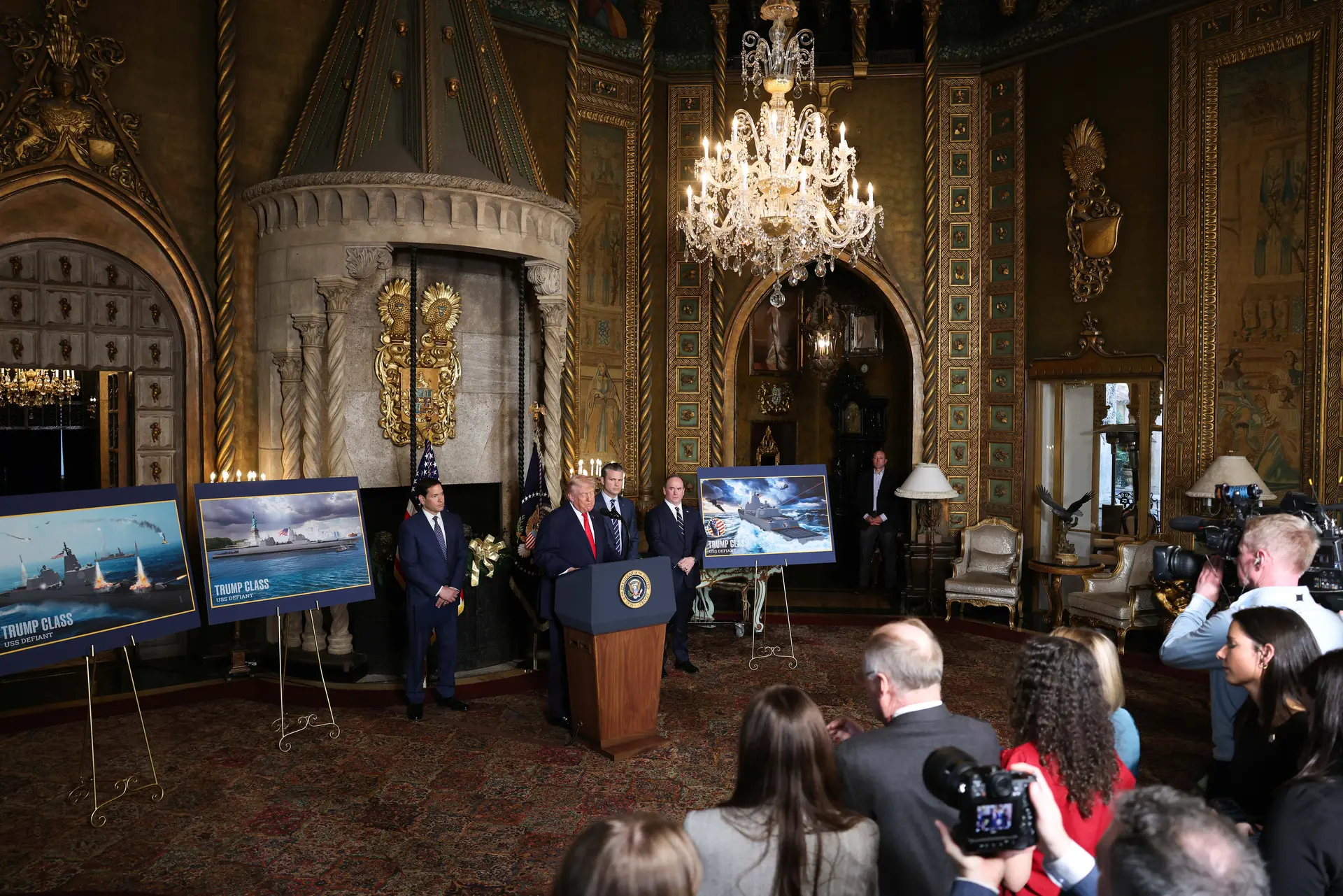 El presidente Donald Trump, acompañado por el secretario de Estado Marco Rubio (izq.), el secretario de Guerra Pete Hegseth y el secretario de la Marina John Phelan, anuncia la creación del acorazado de la “clase Trump” durante una declaración a los medios en la propiedad Mar-a-Lago de Trump en Palm Beach, Florida, el 22 de diciembre de 2025. Trump anuncia que la nueva clase de acorazados se convierte en la pieza central de su programa “Flota Dorada” para reconstruir y fortalecer la industria de construcción naval de Estados Unidos. Tasos Katopodis/Getty Images