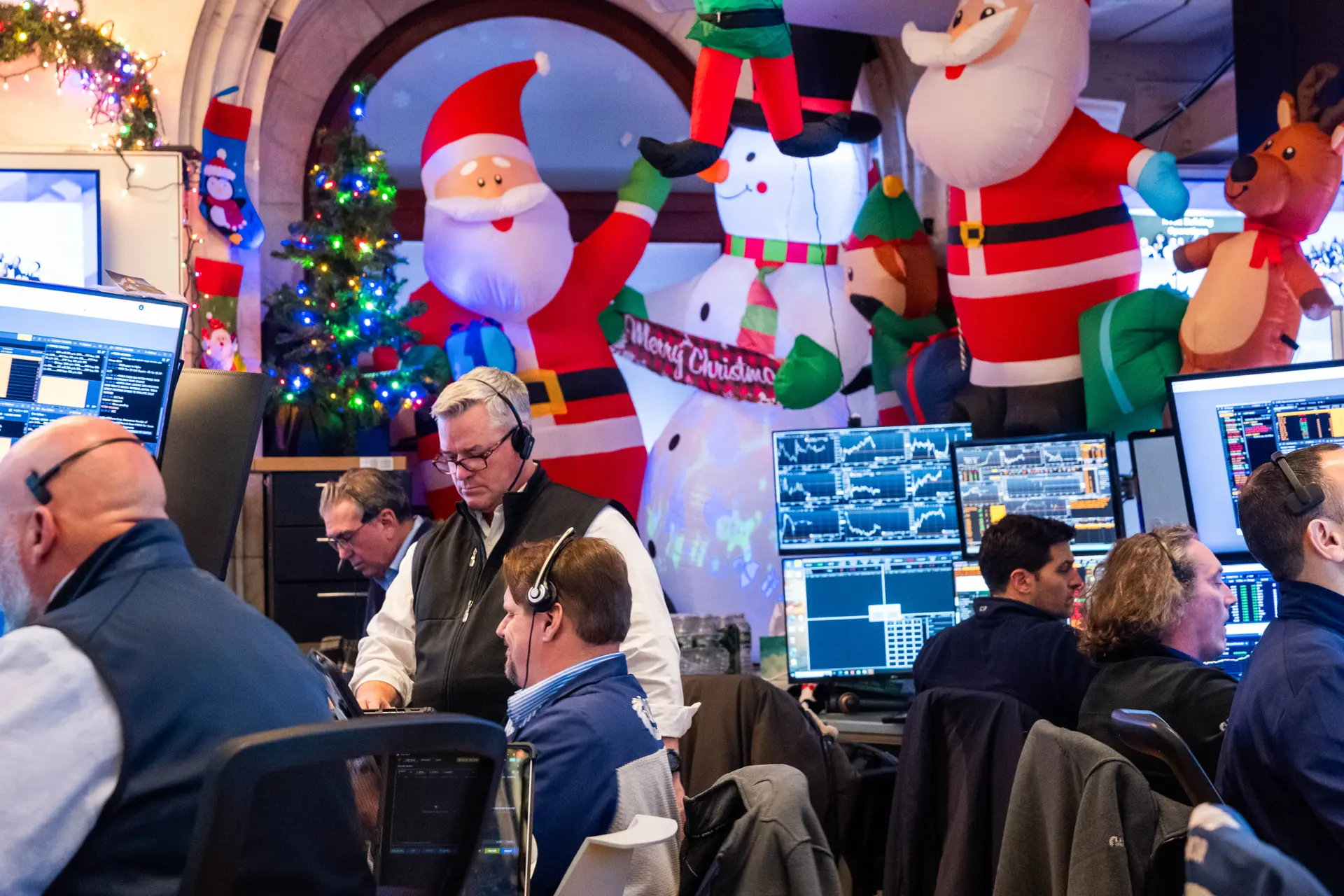 Operadores trabajan en el piso de la Bolsa de Valores de Nueva York durante una jornada de negociación acortada antes del feriado de Navidad en la ciudad de Nueva York, el 24 de diciembre de 2025. El Dow cerró con un alza de casi 300 puntos tras datos económicos positivos, lo que indica fortaleza en la economía de Estados Unidos. Spencer Platt/Getty Images