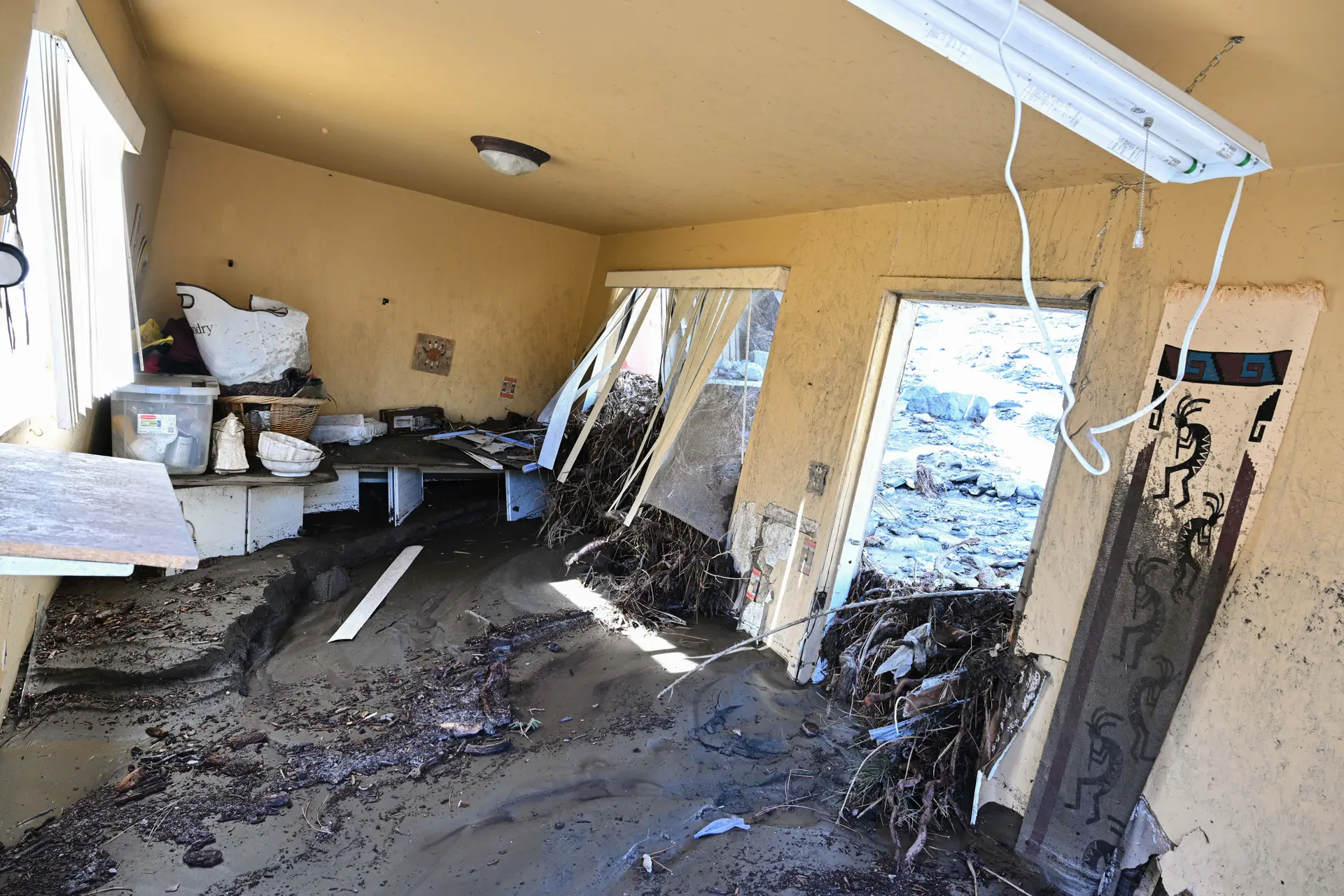 Lodo cubre el interior de una propiedad tras una serie de tormentas en Wrightwood, California, el 25 de diciembre de 2025. William Liang/AP Photo