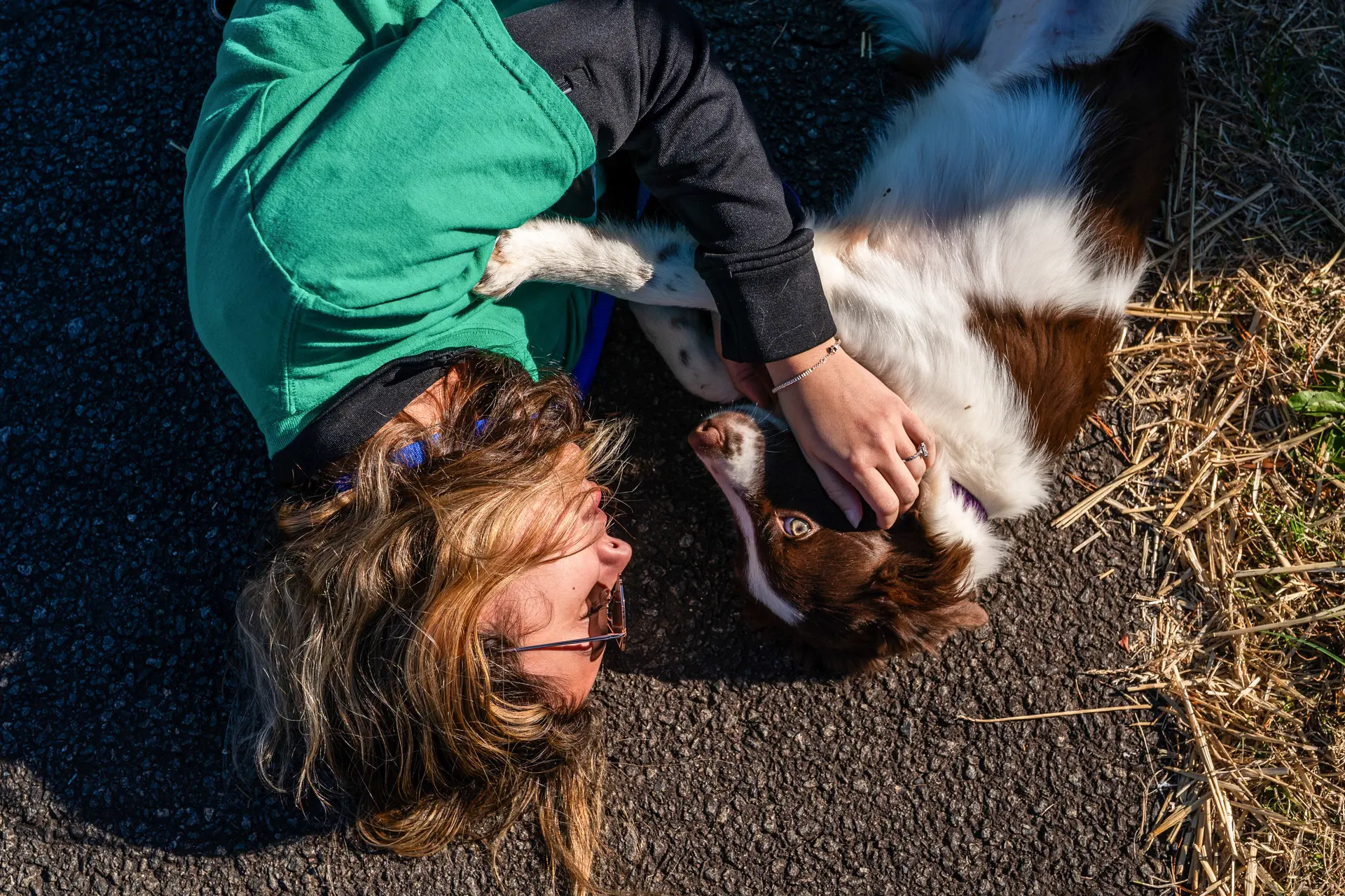 La voluntaria de Seuk’s Army, Katelynn Aldarondo, abraza a un perro de un refugio del sur saturado, que será trasladado en avión a un grupo de acogida y rescate más al norte, mientras yacen en el pavimento entre vuelos de conexión en el Aeropuerto Regional de Culpeper en Brandy Station, Virginia, el 23 de noviembre de 2025. Allison Robbert/AP Photo