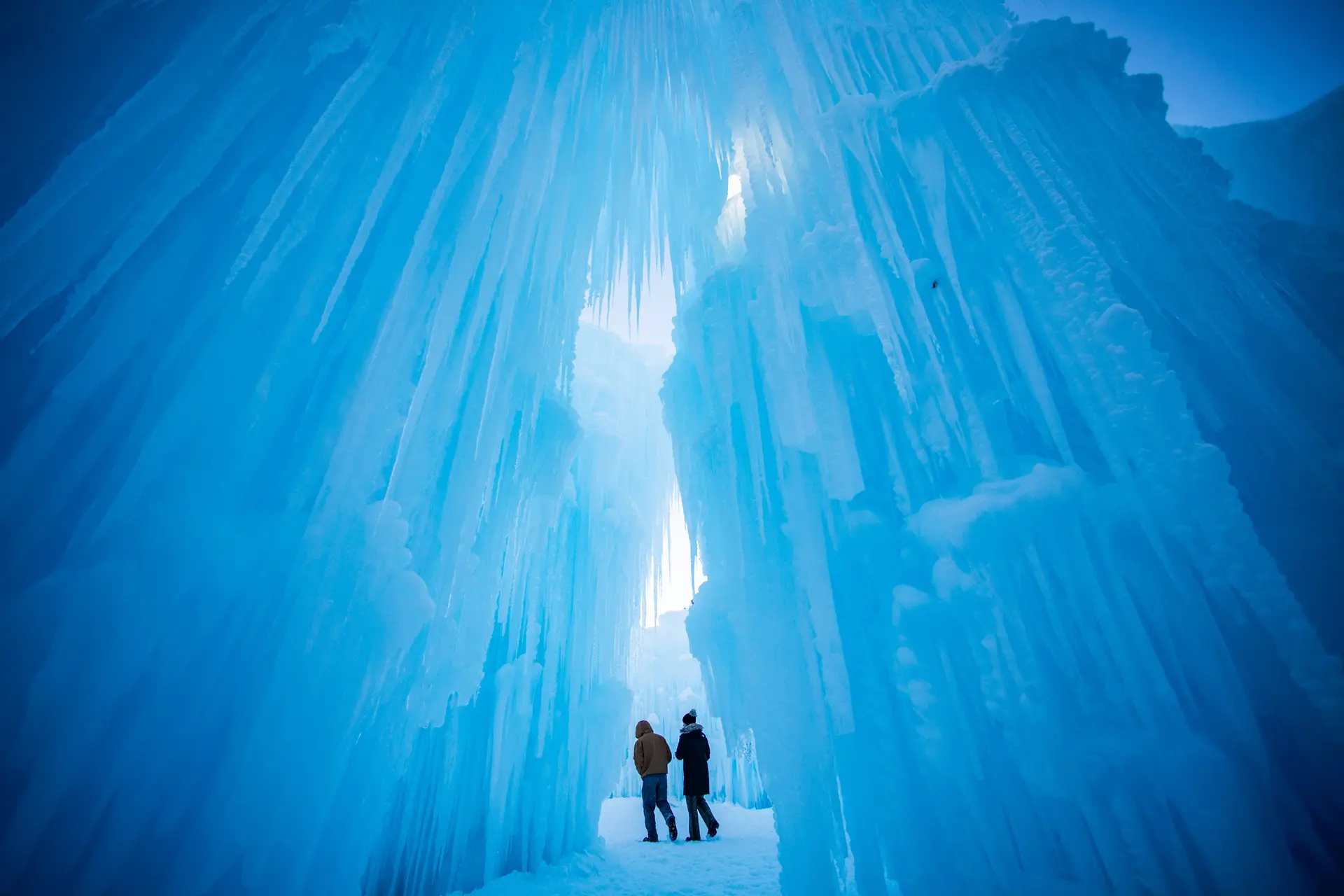 Personas exploran las cavernas y túneles de Ice Castles durante el día de apertura en North Woodstock, New Hampshire, el 27 de diciembre de 2025. Brent Christensen creó su primera obra de hielo en el jardín delantero de su casa para llevar felicidad y alegría a sus hijos y, desde 2011, Ice Castles se dedica a crear un mundo de cuevas de hielo, cascadas congeladas y glaciares formados en arcos, cavernas, toboganes y túneles. Joseph Prezioso/AFP vía Getty Images