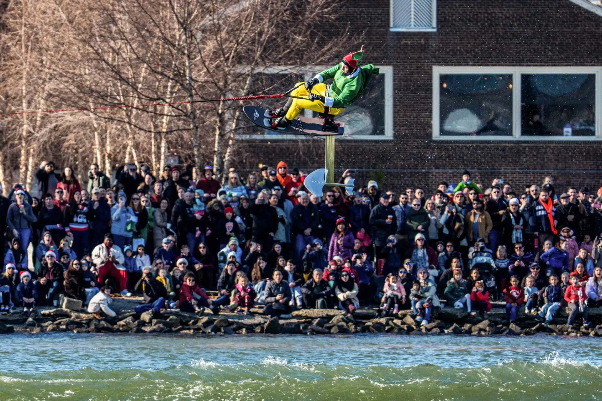 Una persona vestida como elfo navideño practica esquí acuático durante un evento de Santa en esquí acuático en Alexandria, Virginia, el 24 de diciembre de 2025. Santa y sus elfos se enfrentan al Grinch en el espectáculo acuático anual en el río Potomac. Aaron Schwartz/Getty Images