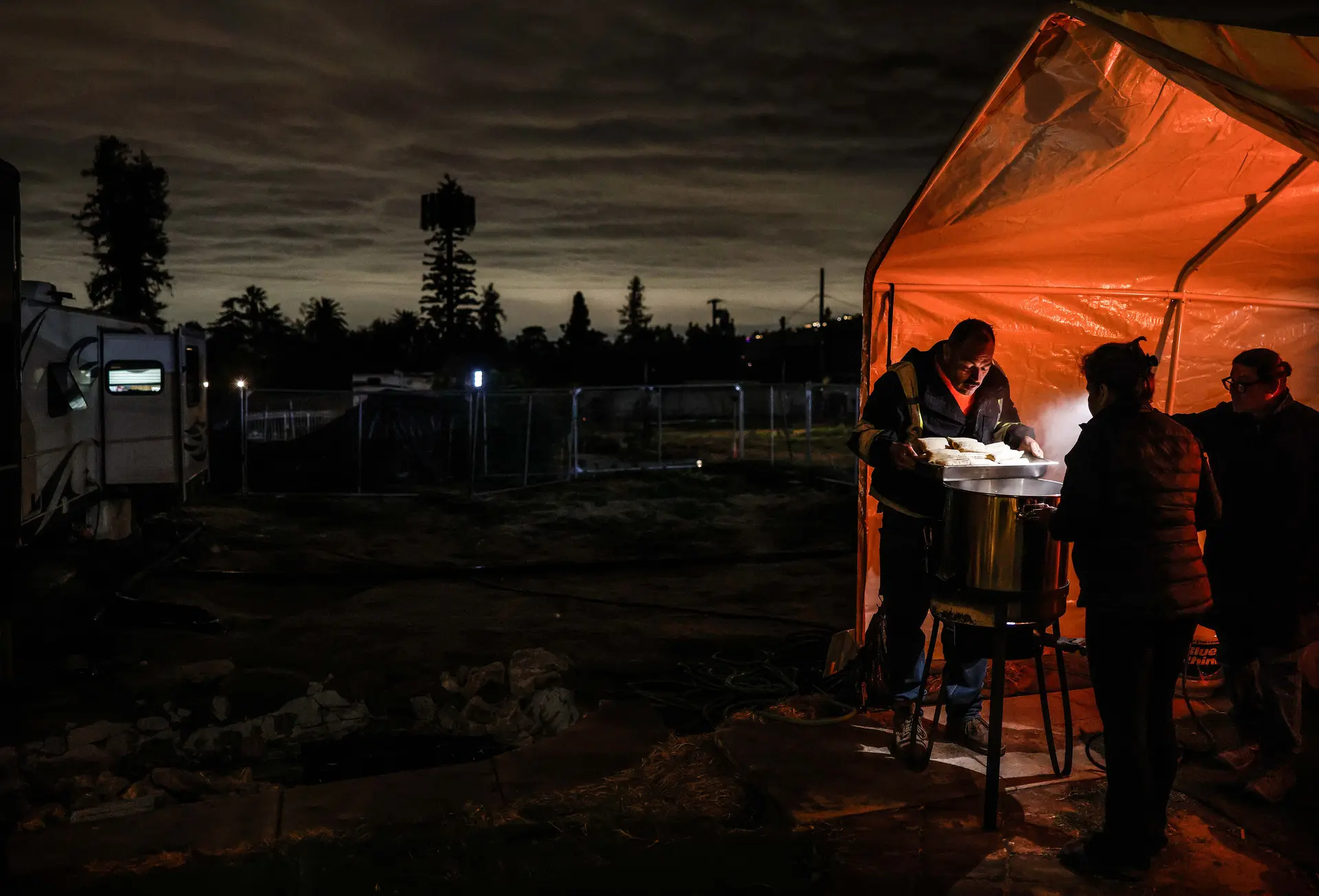 Leticia Serafín (2.ª der.) cocina tamales con su esposo Paul Fonseca (izq.) y su amigo Pedro Jiménez, antes de la tormenta de río atmosférico en Altadena, California, el 23 de diciembre de 2025. La pareja perdió su casa de 25 años en el incendio Eaton y reside en un remolque de viaje donado en su propiedad mientras hace planes para reconstruir. Ellos hacen tamales cada año para distribuirlos a familiares y amigos en la Nochebuena y mantuvieron la tradición este año. Mario Tama/Getty Images