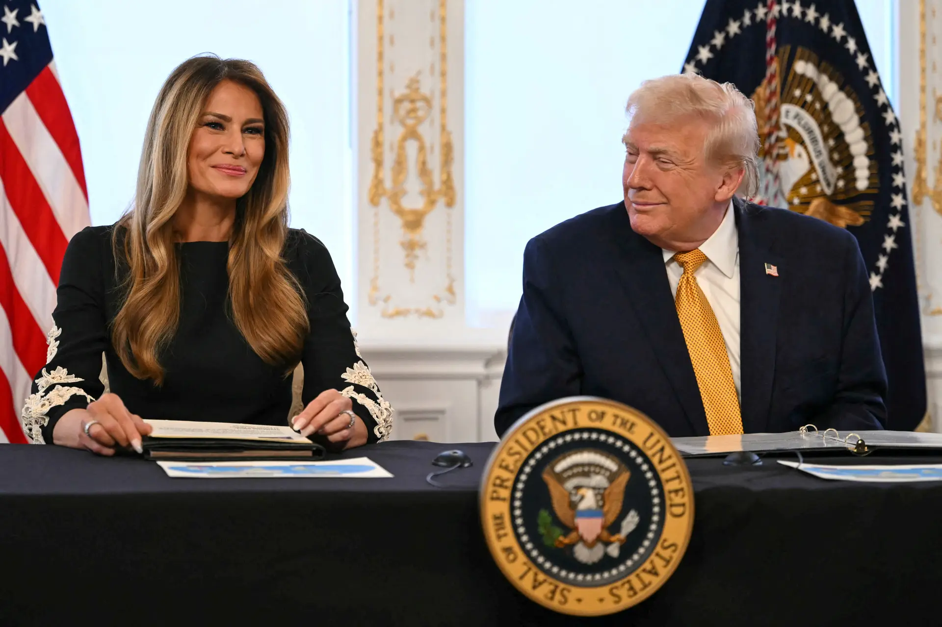El presidente Donald Trump y la primera dama Melania Trump participan en llamadas a miembros del servicio de Estados Unidos en la víspera de Navidad, desde el club Mar-a-Lago en Palm Beach, Florida, el 24 de diciembre de 2025. Andrew Caballero-Reynolds/AFP vía Getty Images