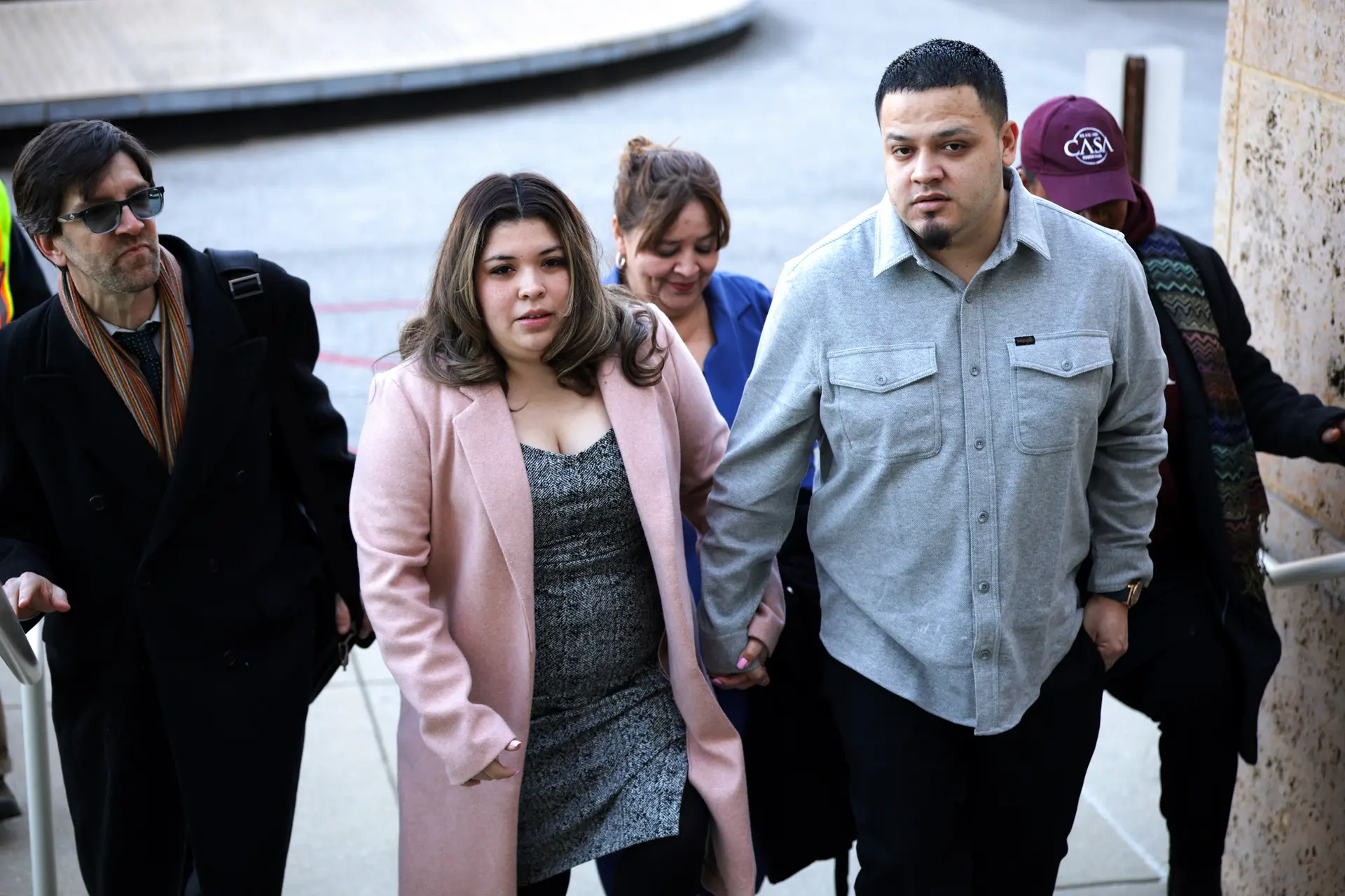 Kilmar Abrego García llega con su esposa Jennifer Vasquez Sura y su abogado Simon Sandoval-Moshenberg (izq.) al Tribunal de Distrito de Estados Unidos para el Distrito de Maryland en Greenbelt, Maryland, el 22 de diciembre de 2025. Abrego García, un inmigrante ilegal que fue deportado a la prisión de alta seguridad CECOT en El Salvador, luego enviado de regreso a Estados Unidos y liberado después de que el tribunal determinó que su detención fue ilegal, asiste a una audiencia sobre si el Servicio de Inmigración y Control de Aduanas puede volver a detenerlo. Alex Wong/Getty Images