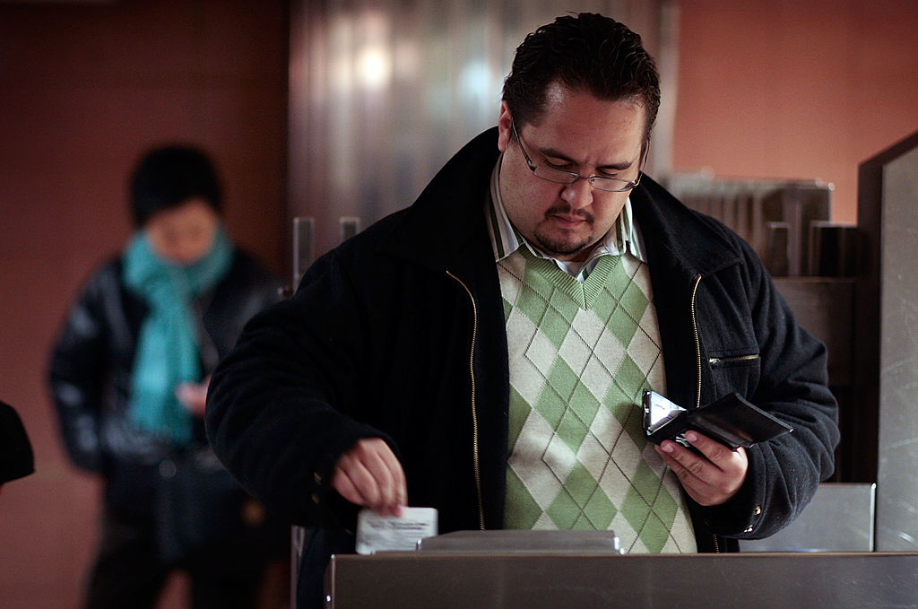 Un pasajero del metro pasa su Metrocard por un lector en la estación Grand Central el 25 de marzo de 2009 en la ciudad de Nueva York. (Foto de Chris Hondros/Getty Images)