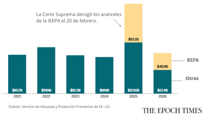 Los ingresos arancelarios totales de Estados Unidos se duplicaron con creces en el año fiscal 2025 con respecto al año anterior.Los ingresos procedentes de los aranceles anulados por la Corte Suprema superan los ingresos arancelarios totales recaudados por Estados Unidos en el año fiscal 2024.