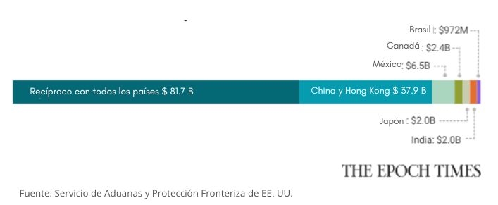 El resto de los ingresos —aranceles sobre las importaciones procedentes de México (impuesto sobre el fentanilo), Canadá (fentanilo y penalización por transbordo), India (impuesto sobre el petróleo ruso y venezolano), Japón (acuerdo comercial) y Brasil (impuesto sobre la libertad de expresión)— representaron el 10.4 %.