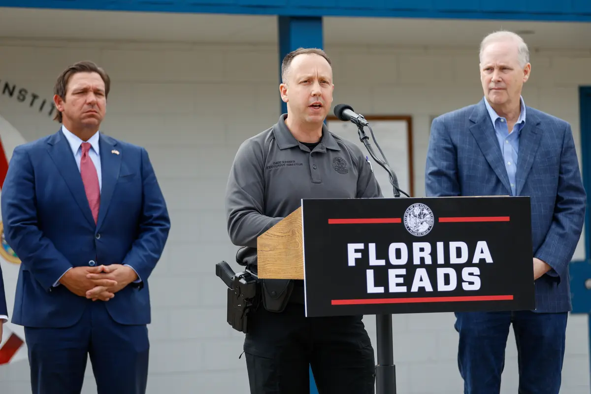 Dave Kerner (C), director ejecutivo del Departamento de Seguridad Vial y Vehículos Motorizados de Florida, describe los esfuerzos de colaboración del estado con el gobierno federal en materia de control de la inmigración durante una rueda de prensa celebrada en el Deportation Depot de Sanderson, Florida, el 5 de enero de 2026. (Natasha Holt para The Epoch Times).El comisionado del Departamento de Policía de Florida, Mark Glass, dijo que su departamento y sus socios del Departamento de Niños y Familias de Florida seguían trabajando con la administración Trump para encontrar a los cientos de miles de niños que, según las estimaciones, fueron traídos al país sin acompañantes.