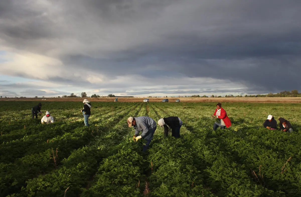 Trabajadores migrantes mexicanos cosechan perejil orgánico en Grant Family Farms, en Wellington, Colorado, el 11 de octubre de 2011. (John Moore/Getty Images)El Departamento de Justicia presentó demandas similares contra otros estados o ciudades santuario el año pasado con el fin de eliminar las barreras a la aplicación de la ley de inmigración, incluyendo Los Ángeles, la ciudad de Nueva York y Minnesota. Un juez federal desestimó un caso en Chicago el año pasado.