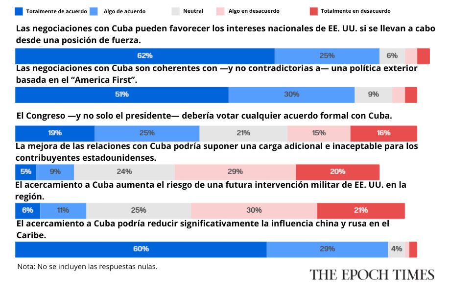 El presidente Donald Trump planteó recientemente la idea de una posible toma de control del país, que alberga a unos 11 millones de personas y se encuentra a menos de 160 kilómetros del punto más cercano de Florida.El 88 % de los encuestados cree que las actuales negociaciones entre EE. UU. y Cuba representan una oportunidad única y genuina para resolver décadas de tensión.