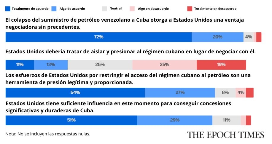 La gran mayoría de los encuestados (el 81 %) cree que los esfuerzos de Estados Unidos por restringir el acceso del régimen cubano al petróleo son una herramienta de presión legítima y proporcionada.