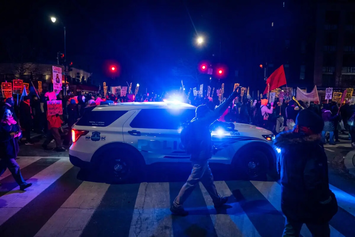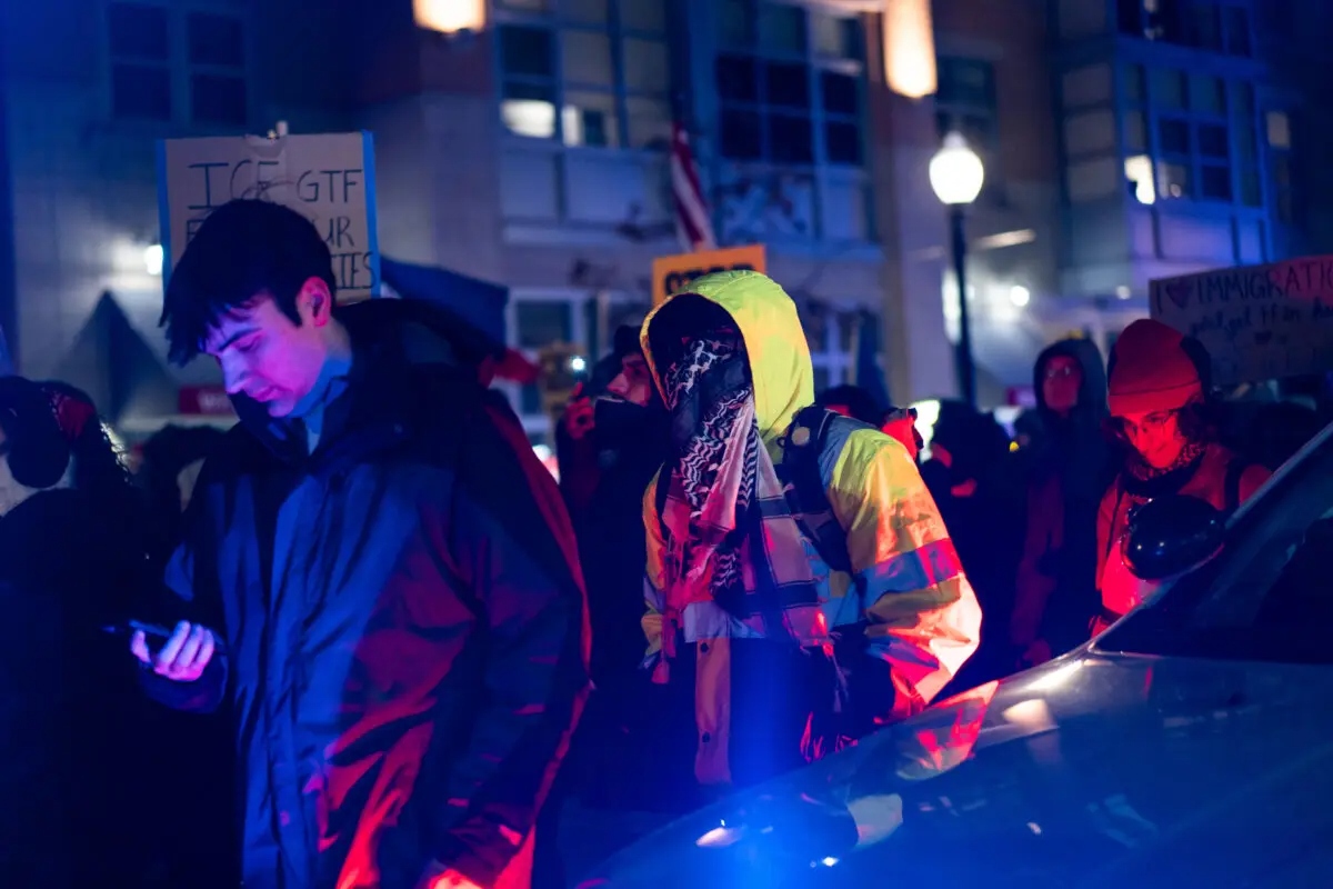 Personas se unen a una marcha para protestar contra las operaciones del Servicio de Inmigración y Control de Aduanas, en Washington, el 20 de enero de 2026. (Madalina Kilroy/The Epoch Times)