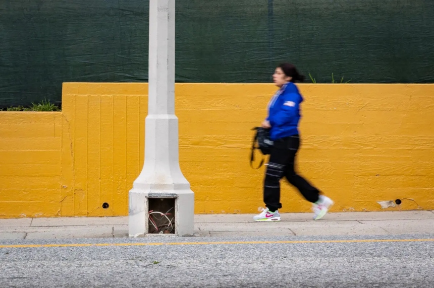 Una mujer pasa junto a una farola que fue objeto de un robo de cables en Los Ángeles, el 4 de abril de 2024. (John Fredricks/The Epoch Times)El informe de USTelecom subrayó que abordar la demanda de cobre robado es tan crucial como proteger las redes. Hizo un llamado a las fuerzas del orden, las empresas y los legisladores para que trabajen juntos.