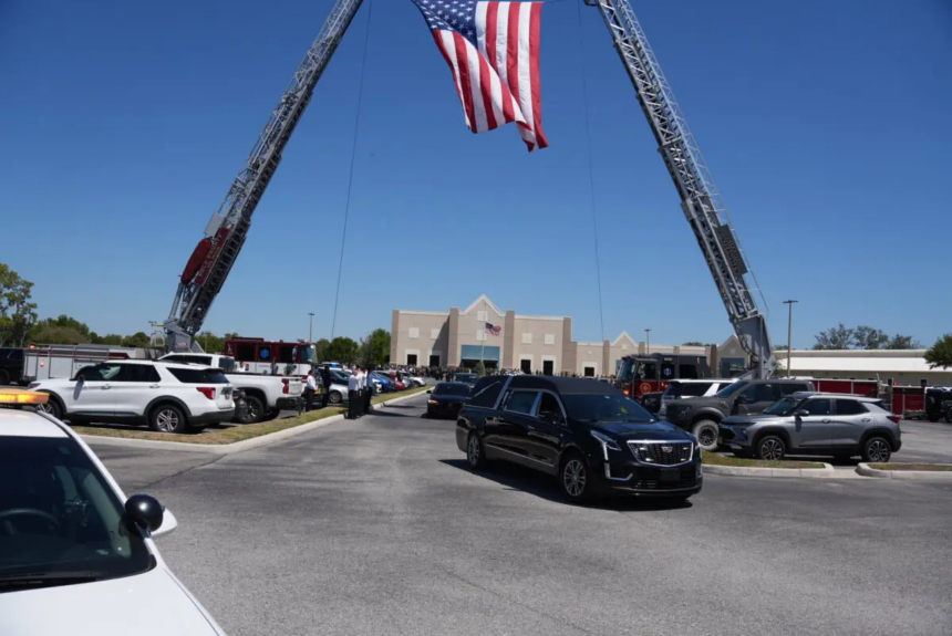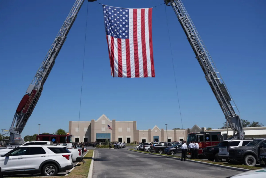 En Winter Haven, Florida, una enorme bandera estadounidense izada por dos camiones de bomberos frente al Haven Worship Center dio la bienvenida a cientos de asistentes al homenaje en memoria del mayor de la Reserva del Ejército Cody Khork.
