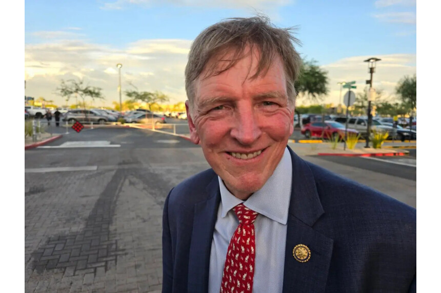 El representante Paul Gosar (republicano de Arizona) afuera de una manifestación en Glendale, Arizona, el 23 de agosto de 2024. (Allan Stein/The Epoch Times)Dijo que le gustaría poder revocar las autorizaciones de empleo de los titulares de visas estudiantiles una vez que abandonen la universidad.